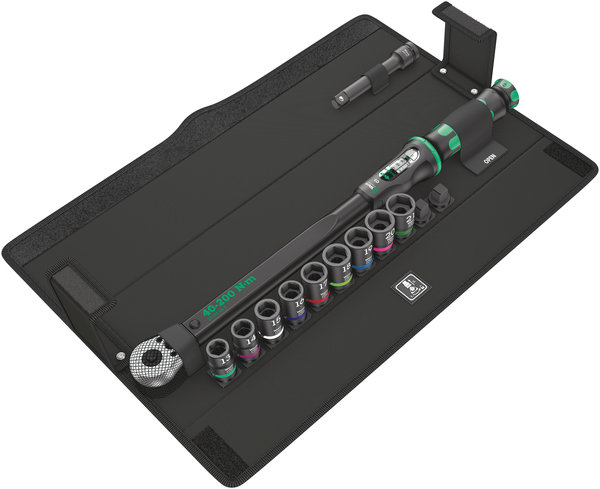 1 Click-Torque C 3 Drehmomentschlüssel mit Umschaltknarre mit 1/2"-Vierkant-Antrieb, Messbereich 40 Nm-200 Nm, Genauigkeit ±3 % vom eingestellten Wert, gemäß DIN EN ISO 6789-1:2017-07, für den Rechtsanzug, Umschaltknarre, 45 Zähne; einfache Einstellung und Sicherung des gewünschten Drehmomentwertes, mit hör- und fühlbarem Einrasten bei Erreichen der Skalenwerte (Feinskala nur in Newtonmetern), hör- und fühlbarer Auslösemechanismus bei Erreichen des eingestellten Drehmomentwerts, ergonomischer 2-Komponenten Griff; 9 Steckschlüsseleinsätze 8790 C Impaktor und 1 kurze Verlängerung 8894 SC für den Einsatz mit Elektro- und Akku-Schraubern (nicht mit Schlagschraubern).