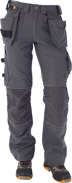 Pantalon de travail en toile 60% coton avec poches suspendues et sangle marteau de J.A.K. Vêtements de travail. 8 poches pratiques, dont les poches genoux avec passepoil réfléchissant sont en tissu Cordura® et extrêmement résistantes. Avec une poche supplémentaire et une sangle pour les outils, ainsi qu'une poche sur la cuisse pour un téléphone portable, ce pantalon en toile convient à de nombreuses fins. Peut être commandé dans de nombreuses tailles différentes, avec la possibilité de personnalisations uniques. Cousu en 60% coton et 40% polyester. Livré dans la couleur Noir.